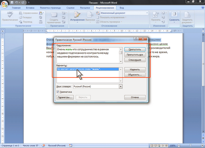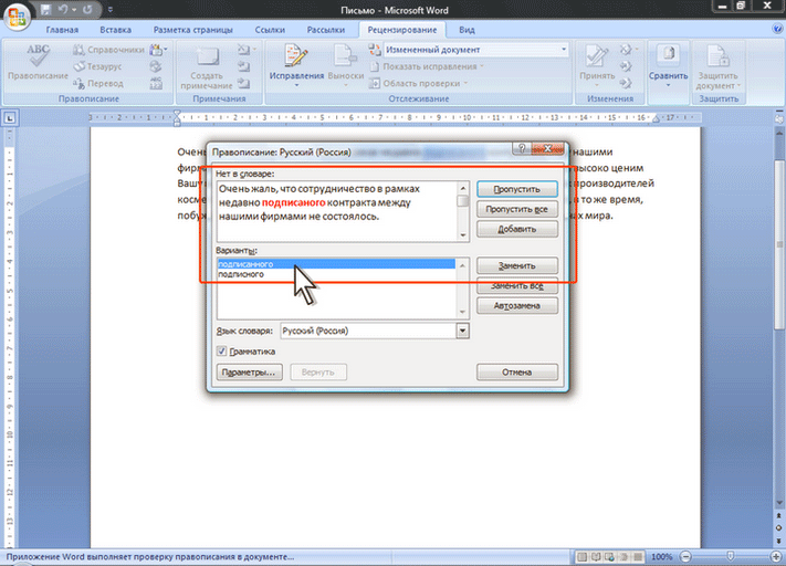 6. Если в нижней части окна нет правильных вариантов написания слова или конкретной грамматической рекомендации, то ошибку следует исправлять самостоятельно. Это можно сделать в верхней части окна, после чего, в зависимости от вида ошибки, необходимо нажать кнопку Заменить, Заменить все или Изменить.