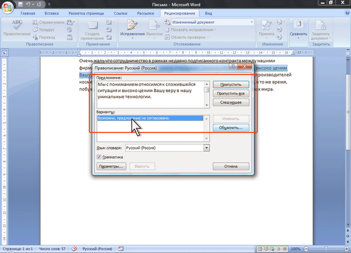 3. Для орфографических ошибок в верхней части диалогового окна Правописание выводится фрагмент текста с ошибочным словом, выделенным красным цветом. В нижней части окна могут быть приведены правильные варианты написания слова (см. рис. 53). Для грамматических и стилистических ошибок в верхней части диалогового окна Правописание выводится предложение с ошибкой. В нижней части окна могут быть приведены грамматические замечания (рис. 54)