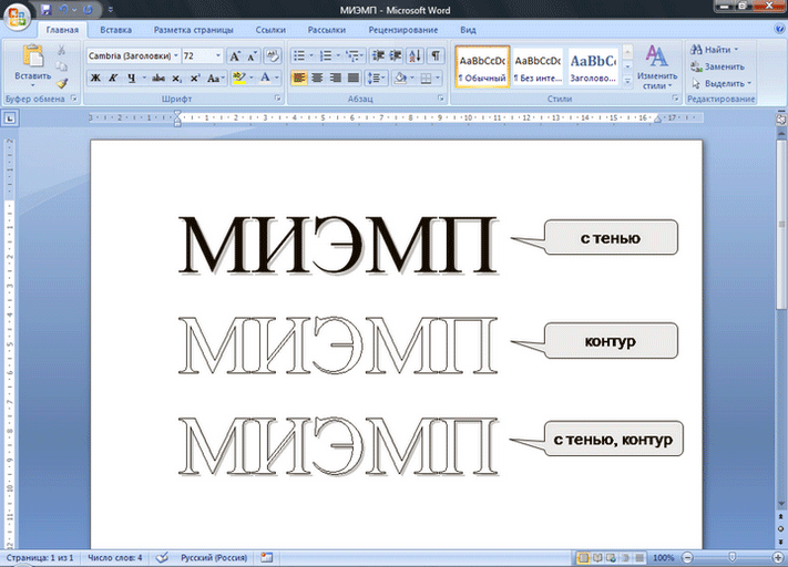 Видоизменения с тенью и контуром (рис. 16) обычно используют в декоративных целях, например, для заголовков. Видоизменения можно использовать совместно. Настроить параметры тени или контура невозможно.