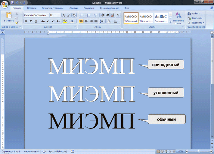 Видоизменения приподнятый и утопленный (рис. 17) также обычно используют в декоративных целях. Наиболее рельефно такой текст смотрится при использовании заливки или фона страницы. Настроить параметры видоизменений невозможно.
