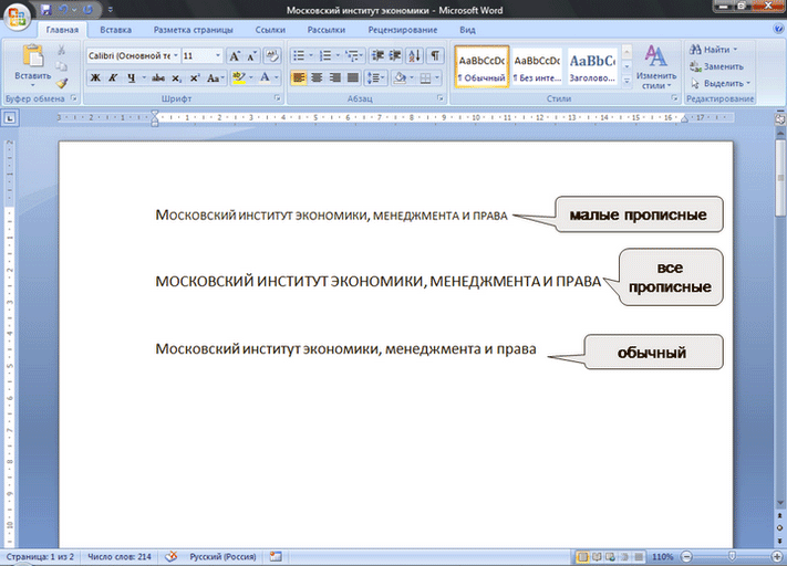 Видоизменения малые прописные заменяет обычные строчные буквы прописными, но несколько меньшего размера, чем обычные прописные буквы (рис. 18). Используют это видоизменение, например, для заголовков. Видоизменение все прописные превращает все буквы в прописные (рис. 18). Более того, во фрагмент текста, оформленный с этим видоизменением, строчные буквы ввести невозможно.