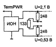 - Активные терминаторы SE имеют импеданс 110 Ом, что позволяет их использовать на более высоких скоростях в Fast SCSI. Их «активность» заключается лишь в наличии внутреннего источника опорного напряжения (ИОН) +2,85 В, питающегося от тех же линий TermPWR. Микросхемы активных терминаторов имеют и электронные ключи, включенные последовательно в каждую линию. Ключи управляются общим сигналом, позволяющим включать-отключать терминатор.