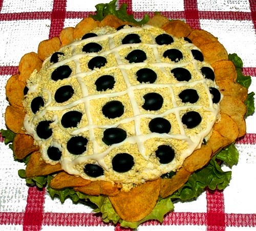 Простое украшение:ломтики картофеля-фри, тертые желтки, майонез или сметана, оливки, салатная зелень.