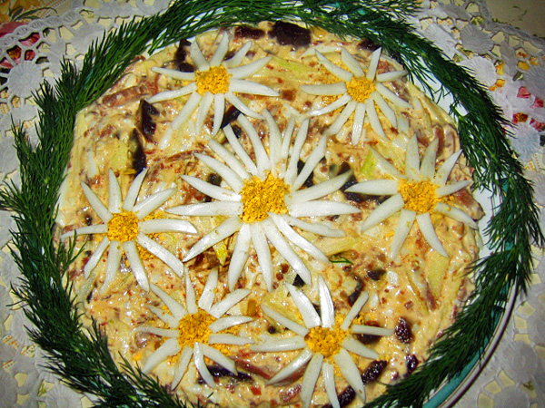 Лепестки "ромашек" нарезаны из яичного белка, серединки - тертый желток. Вокруг выложен веночек из веточек укропа.