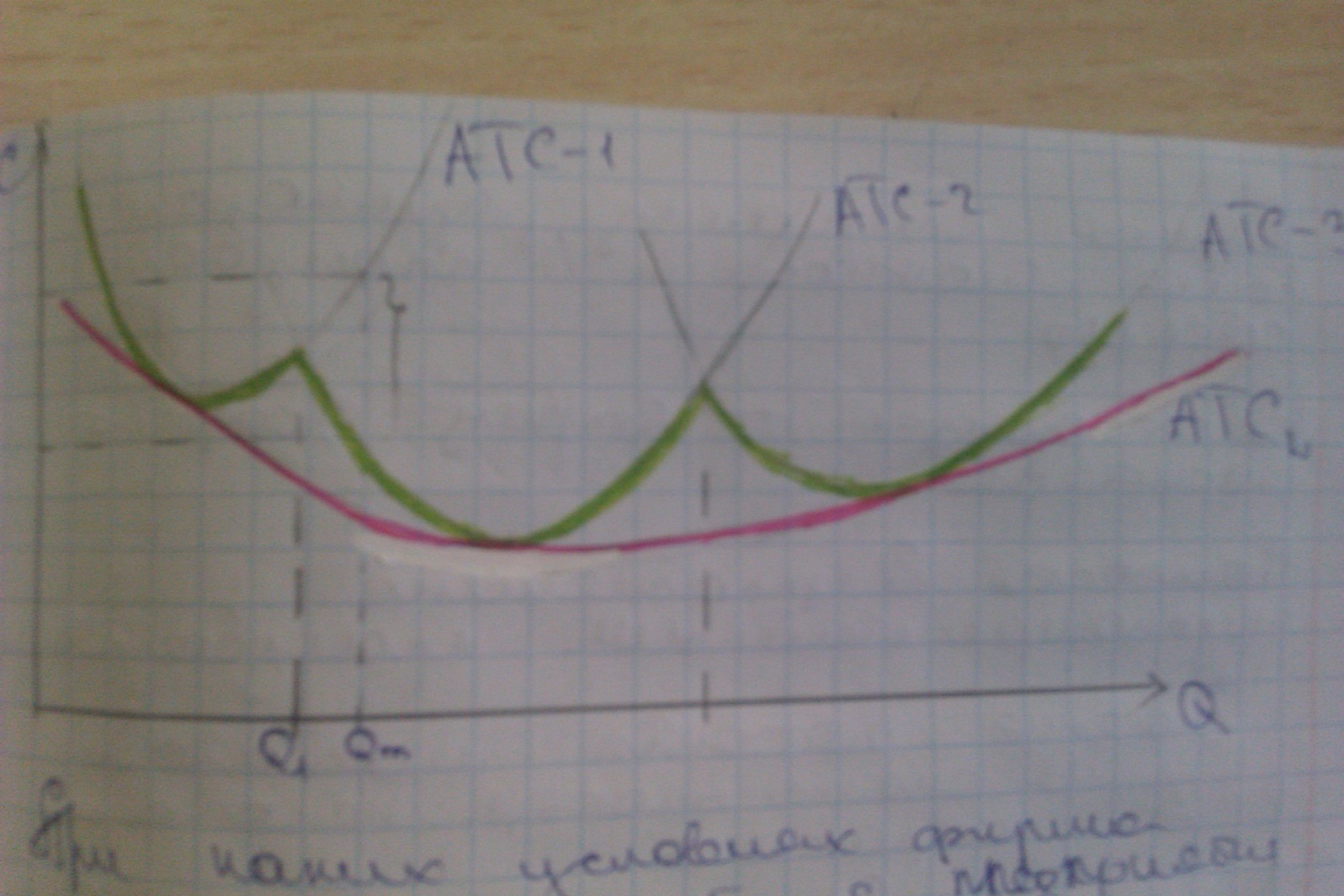 Увеличение масштабов предприятия можно представить как ряд разных по размеру фирм от более мелкого к более крупному (ступеньками) и для предприятия каждого размера построить свою кривую краткосрочных средних издержек.