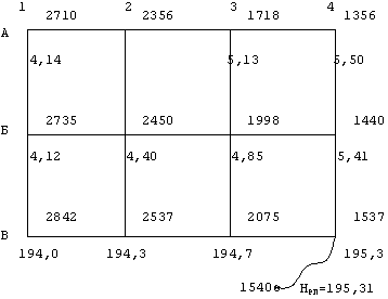 В журнале-схеме (рис.42) записывают отсчеты по черной и красной сторонам рейки, поставленной на землю, поочередно у каждой вершины квадратов. Контроль правильности отсчетов выполняют по разности нулей (РО), которая не должна отличаться от стандартного значения РО равного 4683 или 4783 мм не более 3 мм. Высоты целесообразно выражать в метрах с округлением до 0.01 м. Привязка сетки квадратов к пунктам геодезической сети с целью построения топоплана в принятой системе координат выполняется прокладкой теодолитно-нивелирного хода. В учебном задании таким ходом является обратный ход от пункта 513 до пункта 512 через точки 3 и В1. Высотная привязка точки В1 выполнена замкнутым нивелирным ходом от пункта 512 до точки В1 и обратно без дополнительного контроля высот, что обычно не рекомендуется нормативными документами.