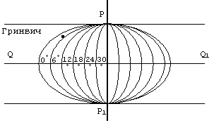 Его совмещ с внутренней пов-тью цилиндра и принимают за ось абсцисс. Чтобы избежать отрицательного значения ординат (у), ординату осевого меридиана принимают не за нуль, а за 500 км, т.е. перемещают на запад на 500 км. Перед ординатой указывают номер зоны.Например, запись координат XМн=6350 км, YМн=5500 км указывает, что точка расположена в 5-й зоне на осевом меридиане (lМн=27° СШ, jМн=54° ВД). Для приближенных расчетов при переходе от географических к прямоугольным зональным коорд считают, что 1° соответствует 111 км (40000км/360° ).Коорд плоскостями, относительно которых определяют положение точек земной поверхности, являются плоскость экватора земного эллипсоида и плоскость начального меридиана, проходящ ч\з Гринвичскую обсерваторию, располож на окраине Лондона. За начало отсчета высот принимают ср уровень Мирового океана. В России отсчет абс высот ведут от нуля Кронштадского футштока. Географич широтой наз угол, образованный нормалью к пов-ти земного эллипсоида в данной точке М и плоскостью экватора. Широты, отсчитываемые от экватора к северу, наз «северными», со знаком плюс; широты, отсчит от экватора к югу, называют «южными», со знаком минус. Они имеют значения от 0 до 90 градусов. Географической высотой точки М наз расстояние по нормали от этой точки до пов-ти земного эллипсоида. Географические координаты позволяют обрабатывать результаты геодез измерений в единой для всей поверхности Земли системы координат.В инженерной геодезии используют плоские прямоугольные координаты. Для установления связи между географиче коорд любой точки на земном сфероиде и прямоуг координатами той же точки на плоск применяют спец способ проект-ия всего земного шара на плоскость по шестиград зонам,простирающ от северного полюса к южному. Счет зон ведут на восток от нулевого, проходящего ч\з Гринвичскую обсерваторию, меридиана. Каждую получ таким образом зону проектируют поочередно на плоскость при помощи цилиндра. Если общую фигуру Земли представить в виде сферы, то ось АВ такого цилиндра будет проходить через центр сферы О. При этом ось вращения земли РР1 будет перпендикулярна оси цилиндра АВ, и каждая зона будет касаться поверхности цилиндра посвоему среднему меридиану. Каждую зону предварительно проект на внутреннюю боковую пов-ть цилиндра при условии сохранения равенства углов, формы и подобия изображ контуров. Зоны переходят на поверхность цилиндра в несколько расширенном виде и, развернув цилиндр, получ плоское изображение земной поверхности. Такую проекцию называют равноугольной поперечно-цилиндрической. Она дает не сплошное изображение всей земной поверхности, а с разрывами, увеличивающимися от экватора к полюсам. В этой системе начало координат в каждой зоне принимают в точке пересечения среднего меридиана с экватором. Ср меридиан зоны принимают за ось абсцисс, поэтому его наз еще осевым меридианом. Изображение экватора в виде прямой, перпендикулярной осевому меридиану, принимают за ось ординат. Абсциссы к северу от экватора +, к югу-. Ординаты, отсчитываемые на восток от осевого меридиана +, на запад-. В инж практике нередко исп произв систему прямоуг коорд, которую еще называют условной. Нач этих коорд выбирают произвольно, а ось Х ориент по направл магн мерид, прох-го ч\з нач коорд