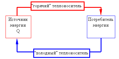 Холодный теплоноситель поступает в устройство, являющиеся источником тепловой энергии для контура (реактор АЭС, котел ТЭС), в нем он нагревается, забирая тепловую энергию. Горячий теплоноситель подается в потребитель тепловой энергии, на выходе из которого, мы вновь имеем холодный теплоноситель.