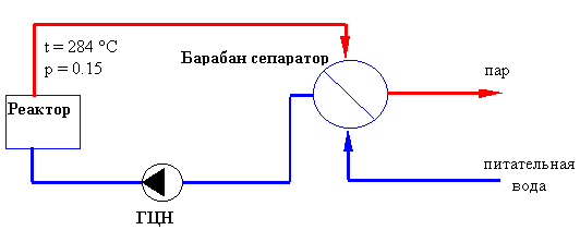 Источником тепловой энергии, как и на всех АЭС, является активная зона реактора. В качестве теплоносителя используется вода, которая проходя через активную зону реактора частично испаряется. На выходе из реактора вода содержит в среднем 15% пара (паросодержание p = 0.15). Давление воды в трактах теплоносителя 0.7 МПа (около 70 атм.) при таком давлении температура кипения воды 284 ° С. Пароводяная смесь из реактора направляется в барабан сепаратор, который в тепловом контуре, выполняет роль потребителя тепловой энергии. В барабане сепараторе из пароводяной смеси забирается пар и добавляется питательная вода, на выходе из барабана сепаратора мы получаем воду в качестве "холодного" теплоносителя,причем температура практически остается такой же.