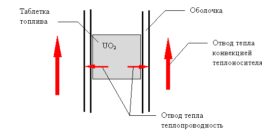 В результате деления, тепловая энергия выделяется в таблетке, которая нагревается. За счет теплопроводности тепловая энергия предается на оболочку. Теплоноситель омывая оболочку снимает тепловую энергию и нагревается, в РБМК теплоноситель частично испаряется.