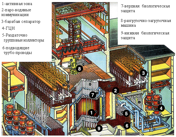 Рассматривая тепловую схему, мы изучали АЭС с точки зрения преобразования энергии, не конкретизируя элементы схемы. Попробуем посмотреть в самых общих четах, что представляют собой эти квадратики и кружочки тепловой схемы, как теперь говорят в натуре. Более детальное описание основных узлов реакторной установки приводятся в, соответствующих разделах далее, здесь же мы ограничимся лишь самыми общими техническими характеристиками