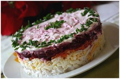 6-й слой: оставшиеся тертые белки (чуть посолить и смазать майонезом)