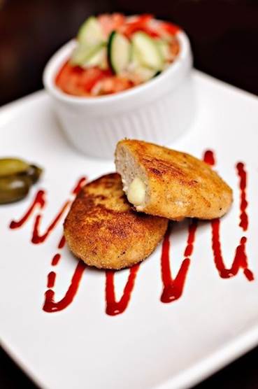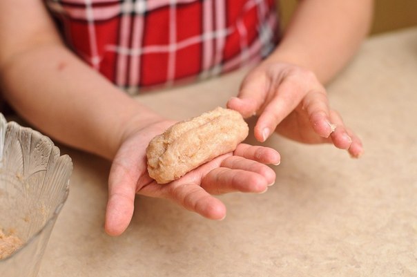 Слепите небольшие котлеты и в середину поместите небольшой прямоугольник сыра.