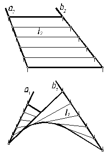 параллелизма различают цилиндроиды – направляющими являются две скре-щивающиеся кривые; коноиды – направляющие – скрещивающиеся линии, но одна из них прямая; косая плоскость – направляющие – две скрещивающиеся прямые.