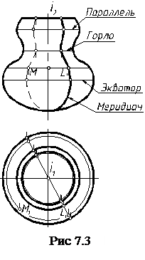Образующая поверхности вращения, лежащая в плоскости, проходящей через ось вращения, называется меридианом. Сечение поверхности плоскостью, перпендикулярной оси, является окружностью, его называют параллелью. Параллель с наименьшим радиусом называют горлом, с наибольшим – экватором (рис. 7.3).
