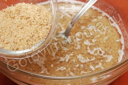 Грецкие орехи измельчить до состояния муки или мелкой крошки.