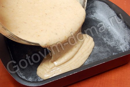 Перелить тесто в смазанную маслом и обсыпанную мукой форму для запекания.