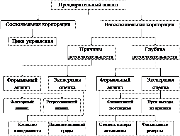 Проводимый текущий анализ финансового состояния корпорации позволяет на качественном и количественном уровне определить степень качества ее финансового состояния. Схема анализа представляет собой иерархическую систему, включающую различные методы статистического и математического анализа с использованием аппарата экспертных оценок для поиска оптимальных путей решения проблем несостоятельной корпорации (рис. 1.2).