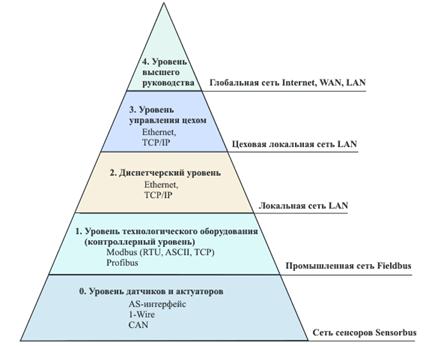 Низший (нулевой) уровень включает в себя датчики и исполнительные устройства (актуаторы): датчики температуры, давления, концевые выключатели, дискретные датчики наличия напряжения, измерительные трансформаторы, реле-пускатели, контакторы, электромагнитные клапаны, электроприводы и др. Датчики и актуаторы могут иметь интерфейсы типа AS-интерфейс (ASI), 1-Wire или CAN, HART и др.