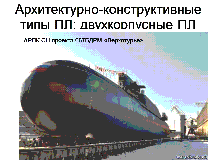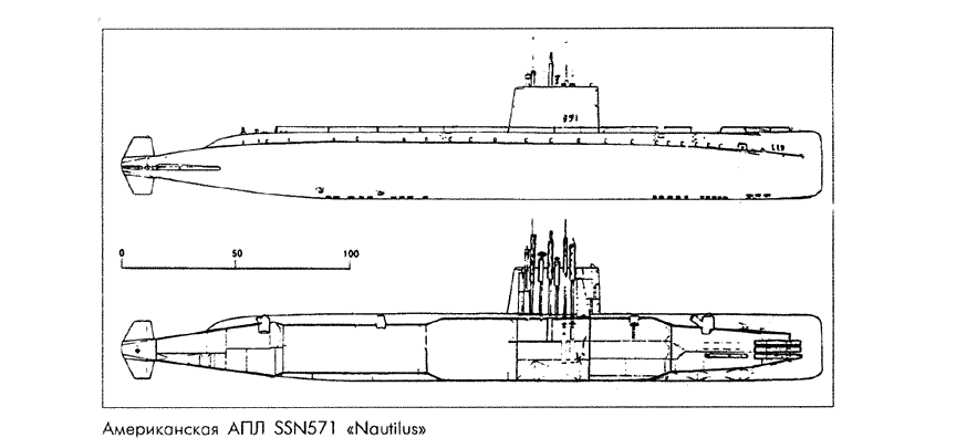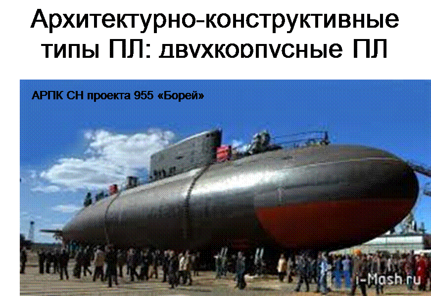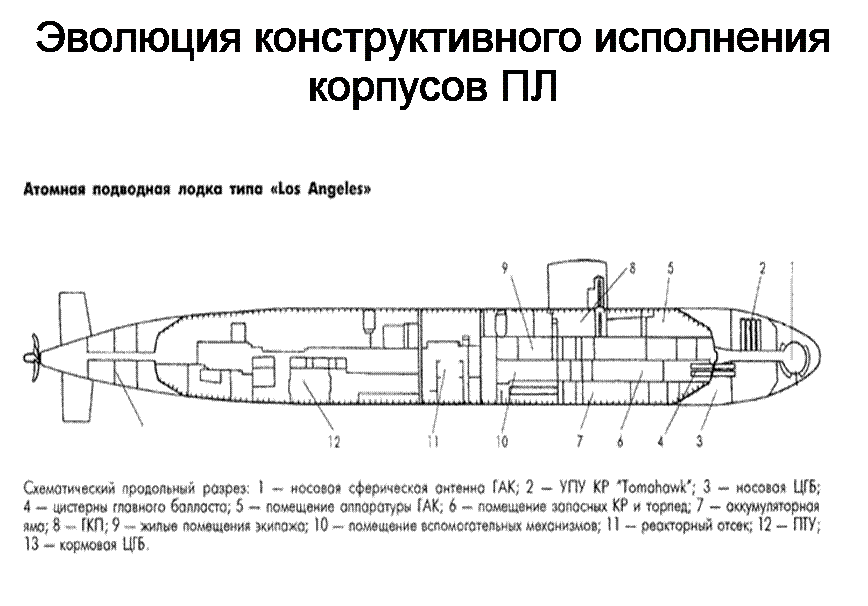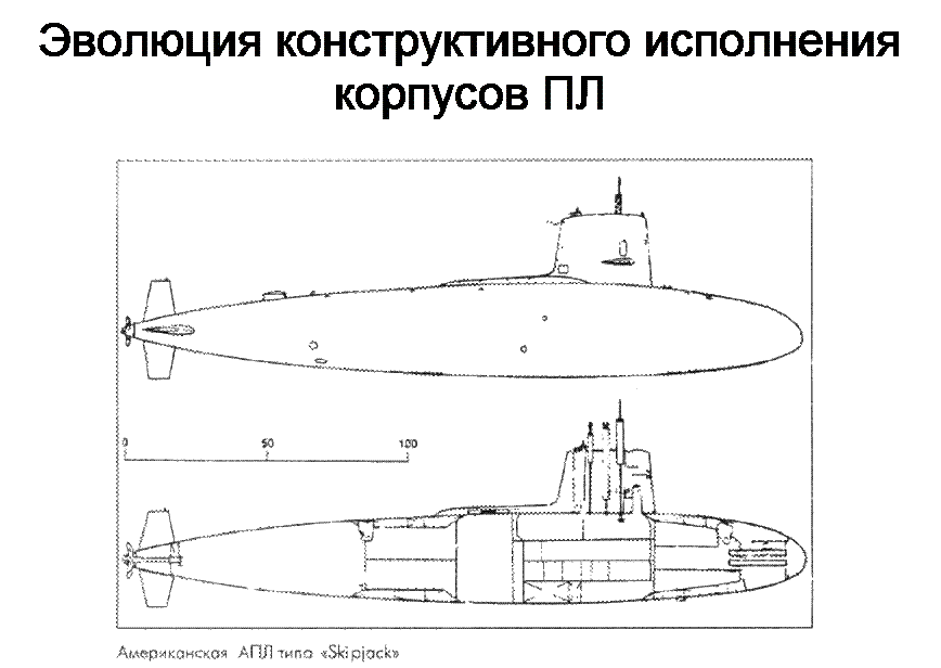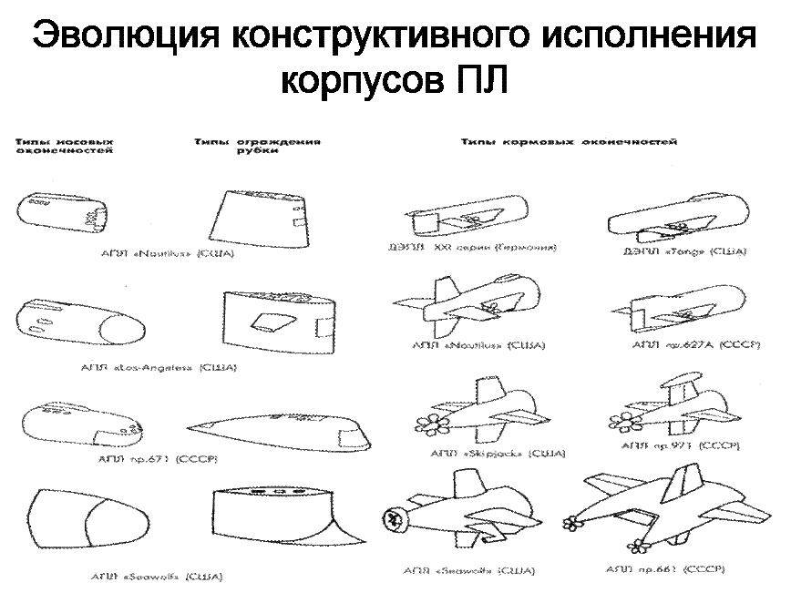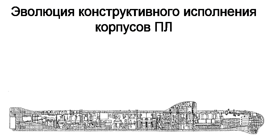 | 1 поколение "Nautilus", "Seawolf" ("Skate")) Пр. 627, 658,659, 645 | 1. Корпус смешанного типа: на большей части длины -однокорпусная конструкция, а двухкорпусная сохранялась в районе носовых торпедных отсеков и турбинного отсека ("Nautilus" и "Seawolf" или кормового торпедного отсека ("Skate")). 2. Корпуса АПЛ и надстройки выполнены по типу корпуса ДЭПЛ "Tang". | 1. Архитектурно-конструктивное исполнение: двухкорпус-ная АПЛ. 2. Форма корпуса - близкая к осесимметричной, с обтекае-мым каплеобразным носом. В кормовой части обводы поперечных сечений становились эллиптическими и постепенно сводились к плоским. 3. Новая форма ограждения рубки, которая в советском кораблестроении получила наименование "лимузинной", отличающемуся соотношением высоты к длине меньше единицы и плавным переходом крыши в наклонную кормовую кромку. Для такой формы характерно объемное обтекание и низкий коэффициент сопротивления. 4. Сокращение количества плохообтекаемых деталей на корпусе (кнехтов, киповых планок, леерных стоек и т.п.) |
