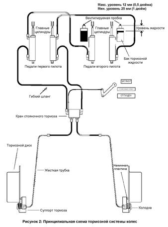 Левый и правый главные цилиндры первого пилота соединяются также двумя гибкими шлангами с краном стояночного тормоза. Кран стояночного тормоза соединяется гибкими шлангами с суппортами тормозов основных опор шасси. Кран стояночного тормоза установлен на полу фюзеляжа за креслами. Кран стояночного тормоза соединяется тросом с рычагом, установленным на центральной панели в кабине.