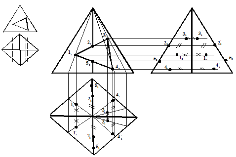 При решении задач подобного типа необходимо предварительно проанализировать вид секущих плоскостей. Если вырез строится для гранного тела, то необходимо строить точки пересечения следов секущих плоскостей с ребрами гранного тела, а также точки пресечения следов секущих плоскостей между собой (эти точки обычно принадлежат граням тела). Для удобства построения точки желательно пронумеровать по порядку. После построения точек, принадлежащих либо граням, либо ребрам тела на всех проекциях, точки соединяют в необходимой последовательности прямыми линиями. После этого необходимо оформить чертеж окончательно, учитывая видимость и невидимость вновь образованных ребер.