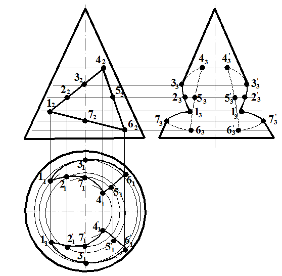 Если вырез строится для тела вращения, необходимо выяснить, какая кривая будет являться результатом сечения той или иной плоскостью заданного тела. Необходимо прежде всего строить точки пересечения следов секущих плоскостей, а затем ряд дополнительных точек, принадлежащих следам. После построения выбранных точек на всех проекциях, их плавно соединяют. Затем необходимо окончательно оформить чертеж, учитывая видимость вновь образованных ребер (рис.7.6).