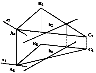 Две плоскости пересекаются по прямой линии. Для построения линии пересечения двух плоскостей достаточно построить две точки, принадлежащей одновременно двум заданным плоскостям. Для построения линии пересечения двух плоскостей общего положения обычно используют метод вспомогательных секущих плоскостей.