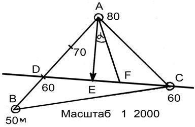 При определении элементов залегания по трем точкам мы делаем допущение, что поверхность напластования представляет собой плоскость. Исходим из того обстоятельства, что между максимальной и минимальной отметками всегда имеются промежуточные. Поэтому, соединив между собой точки поверхности пласта (А и В), имеющие максимальную и минимальную отметки, разделим эту прямую на равные отрезки, количество которых равно разнице между максимальной и минимальной отметками, деленной на величину сечения горизонталей данной карты (рис.8). Таким образом, мы находим на этой прямой местоположение проекции точки (Д) поверхности пласта с отметкой, равной отметке в точке С (в данном случае 60 м). Соединив эти точки, получим линию простирания (СД). Опустив на нее перпендикуляр из точки А, получим проекцию линии падения (АЕ). От основания этого перпендикуляра (точка Е) вдоль линии простирания (в любую сторону) отложим отрезок (EF), равный в масштабе карты разнице абсолютных отметок точки А (80 м) и линии простирания СД (60 м) - в данном случае она равна 20 метрам. Соединим точку F с точкой А и получим угол падения FАЕ (α). Далее можно провести из точки А меридиан, а затем с помощью транспортира определить азимуты падения и простирания.