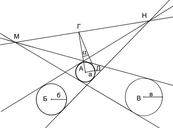 Определение элементов залегания методом окружностей проводится следующим образом. Допустим, имеется три скважины А, Б, В (рис.9) с абсолютными отметками кровли пласта соответственно а, б, в. Вокруг точек, обозначающих положение скважин, проводим окружности, радиусы которых равны абсолютным отметкам кровли в масштабе данной карты. Затем, проведя попарно к окружностям касательные до их пересечения, получим точки М и Н.