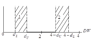 – граница признания отсутствия автокорреляции остатков; 1 – зона неопределенности в случае предполагаемой положительной автокорреляции; 2 – зона неопределенности при отрицательной автокорреляции