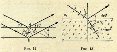 Решение. Дифракция рентгеновских лучей на кристаллах - это результат интерференции рентгеновского излучения, зеркально отражающегося от системы параллельных плоскостей, которые проходят через узлы - атомы (например, А) кристаллической решетки. Эти плоскости называют атомными (рис. 12). Отражение наблюдается лишь в тех направлениях, соответствующих дифракционным максимумам, которым удовлетворяет соотношение