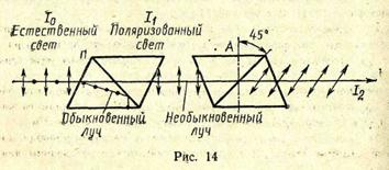 , то отраженный и преломленный лучи взаимно перпендикулярны (рис. 13). Проходящий свет поляризован лишь частично. Из выражения (1) находим