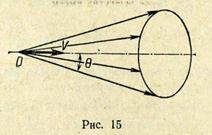 Свет, возникающий на каждом малом участке траектории заряженной частицы, распространяется вдоль образующих конуса, вершина которого О (рис. 15), расположена на этом участке, ось совпадает с траекторией частицы, а образующие составляют с осью угол