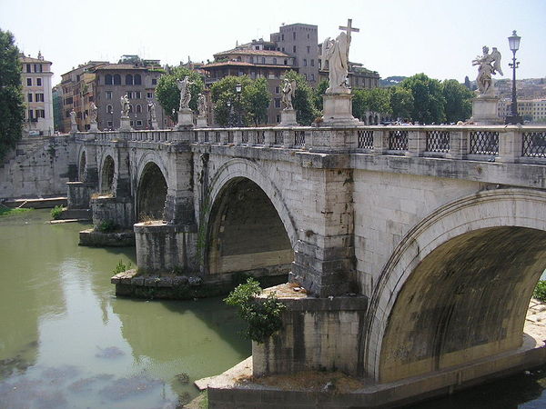 The Romans already knew cement and used it for constructing piers in rivers. They developed special technologies to pour concrete into the water within a ring of wooden piles driven into the riverbed. The Romans often sealed the ring with clay; therefore, they invented a cofferdam. Many Roman bridges have survived because they stand on cofferdam foundations, like for instance, the Pont Sant’Angelo Bridge, the finest surviving bridge in Rome, built across the Tiber River over 1,800 years ago. The bridge has seven stone arches and five main spans about 18 m each, supported on seven-meter piers. In the Middle Ages the bridge parapets were decorated with the statues of Saints Peter and Paul and ten statues of angels (fig.6.1a).