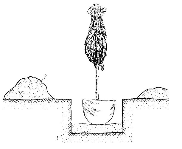 Для посадки древесных саженцев с оголенными корнями выкапывают ямы квадратной или круглой формы. После выкопкп дно ям разрыхляют па глубину 10—12 см. Сажать можно в свежевырытые ямы, а лучше их выкопать за 5-7 дней до посадки растений. За это время происходит «проветривание», обогащение нижних горизонтов почвы кислородом.