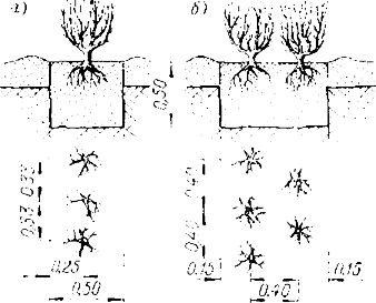Рис. 16. Схема посадки кустарников в живую изгородь а — в одни ряд; б — в два ряда