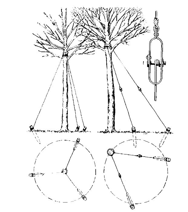 Рис. 21. Схема укрепления крупного дерева с помощью проволочных расгяжек с механическими регуляторами