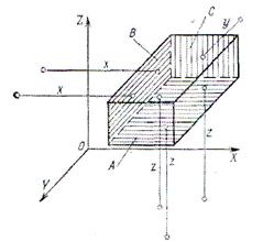 При этом двусторонние связи, символизируемые координатами z, могут быть представлены в виде недеформируемых стержней, сохраняющих, однако, способность скользить по плоскости XOY вдоль осей ОХ и OY, не отрываясь от нее и от нижней плоскости А призматического тела. В результате этого призматическое тело лишается трех степеней свободы, т. е., в частности, оно теряет возможность поступательного движения вдоль оси OZ и вращательного движения вокруг осей ОХ и OY. Для лишения тела еще двух степеней свободы, т. е. лишения возможности перемещений вдоль оси ОХ и поворотов вокруг оси OZ, необходимо соединить его боковую поверхность В двумя двусторонними связями (координатами х) с плоскостью YOZ. Для полной ориентировки тела в пространстве необходимо лишить его шестой степени свободы, т. е. возможности перемещения вдоль оси OY; для этого следует соединить поверхность С одной двусторонней связью у с плоскостью XOZ.