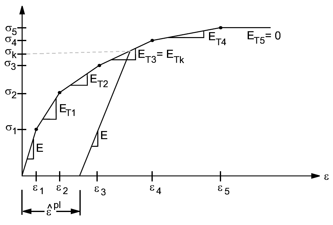 Для механического упрочнения текущее значение предела текучести σk является функцией от величины совершенной пластической работы. В случае изотропной пластичности (о которой сейчас и идёт речь) σk может быть определен через эквивалентные пластические деформации (4.17) и графика напряжений-деформаций (рисунок 4.4).