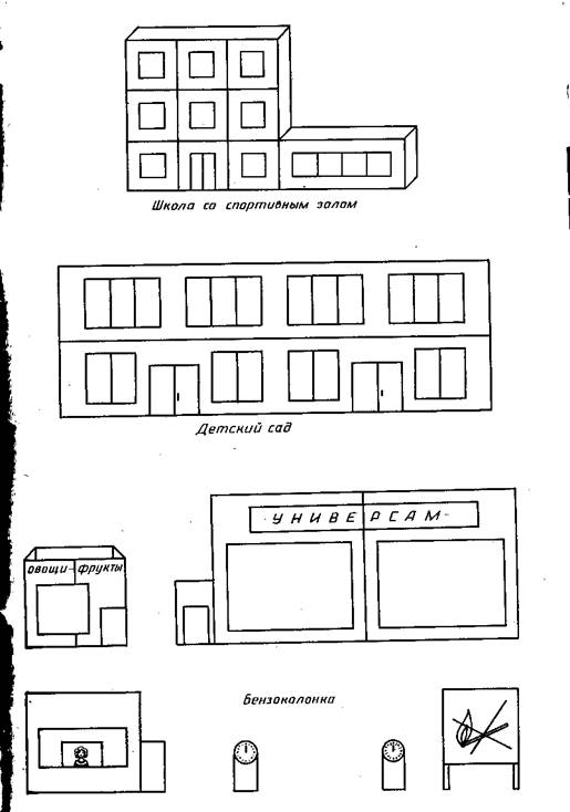 Следующее контрольное задание заключается в конструировании по образцу — сначала по объемному, затем по графическому. Если дети справляются с выполнением конструкций несложных образцов, то полезно усложнить задание, предложив индивидуальные работы. Можно дать задание по конструированию двух предметов (например, магазина и аптеки), имеющих общее строение, но содержащих разные существенные детали (разное расположение входов, разное количество окон, витрин и т. д.).