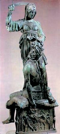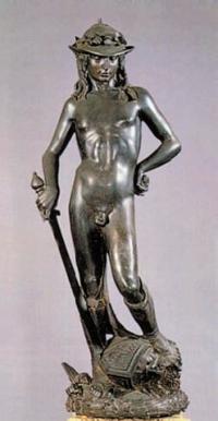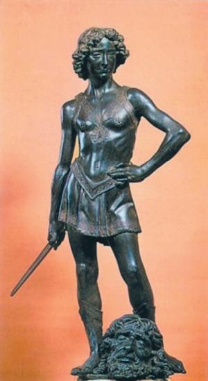 Творчество великого итальянского скульптора Донателло (ок. 1386 – 1466) знаменует собой начало новой эпохи в истории искусства – эпохи Возрождения. Донателло одним из первых художественно осмыслил опыт античного искусства и пришел к созданию классических форм ренессансной скульптуры. Флорентиец Донателло работал главным образом в родном городе, но также и в Сиене (1423 – 1434 и 1457 – 1461), Риме (1430 – 1433), Падуе (1444 – 1453). Среди множества его работ отметим следующие: статуя Святого Георгия (1416, мрамор, Национальный музей, Флоренция); статуи пророков для кампанилы флорентийского собора (1416 – 1435, мрамор); рельеф «Пир Ирода» на бронзовой купели баптистерия в Сиене (1423 – 1427); алтарь «Благовещение» (1428 – 1433, терракота, церковь Санта‑Кроче, Флоренция); знаменитая статуя Давида (1430‑е годы, бронза, Национальный музей, Флоренция) – первое изображение нагого человеческого тела в скульптуре Возрождения; конный памятник кондотьеру Гаттамелате (1447 – 1453, Падуя) – первый светский монумент эпохи Возрождения; скульптурный алтарь (1446 – 1450) для церкви Сант‑Антонио в Падуе; скульптурная группа «Юдифь и Олоферн» (1456 – 1457, бронза) на площади Синьории во Флоренции. Идеи Донателло оказали огромное влияние на творчество многих итальянских скульпторов и живописцев эпохи Возрождения.