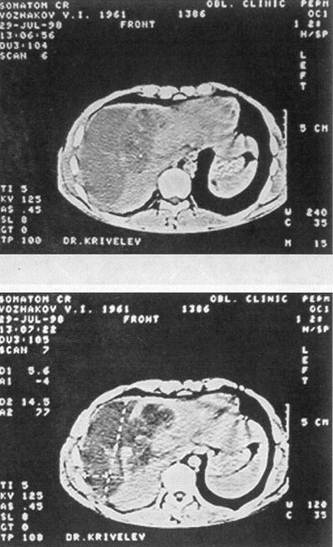 Рис. 8. Компьютерная томография печени больной К., 24 года, через 12 дней после