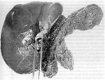 Рис 11 Печень погибшего во время операции больного С , 34 года (21 05 79 г) размозженная правая доля печени, левая — оторвана, виден полный поперечный разрыв воротной вены, в просвет которой введен пинцет
