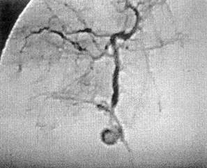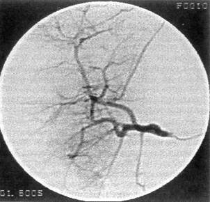 Суперселективная рентгеноэндоваскулярная эмболизация ветвей печеночной артерии, повреждение которых явилось источником кровотечения, произведена двум пострадавшим; достигнут хороший гемостатический эффект. Эндоваскулярную эмболизацию предполагалось выполнить еще одному больному, у которого при гепатографии в бассейне левой печеночной артерии выявлена ложная аневризма размером 5,0x4,0 см, овальной формы, с неоднородным контрастированием — частичный тромбоз. Суперселективно катетеризирована левая печеночная артерия, но ввести спираль Гиантурко в артерию не удалось из-за выраженного спазма сосуда. На следующий день предпринята повторная попытка эндоваскулярной эмболизации, однако при целиакогепатографии выяснилось, что левая печеночная артерия не контрастируется, а полость аневризмы не заполняется контрастом. После проведенных манипуляций прекратились кишечные кровотечения, а уровень билирубина крови снизился до нормальных показателей. Очевидно, у данного больного катетеризация левой печеночной артерии сопровождалась травмой интимы с последующим тромбозом просвета сосуда, что привело к прекращению поступления крови в желчные ходы.