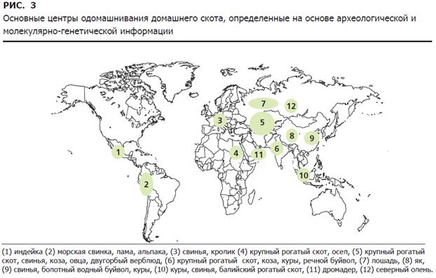 Приручение домашнего скота, как это принято сейчас считать, произошло в 12 центрах мира (рис. 3).