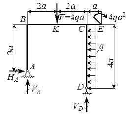 -VA×4a - НА×a - 4qa2 + q×4a×2a + F×2a = 0, откуда VA = 2qa.