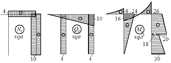 Э п ю р а Nz. Стойка CD сжимается силой NCD = -VD = -10qa, а ригель ВС растягивается силой NBC = F = 4qa. В остальных стержнях продольной силы нет.