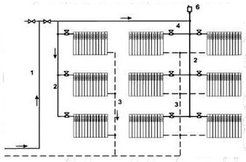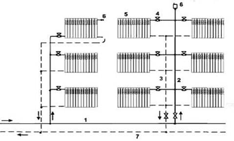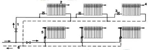 Рис. 1. Схема горизонтальной двухтрубной системы отопления.