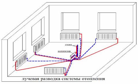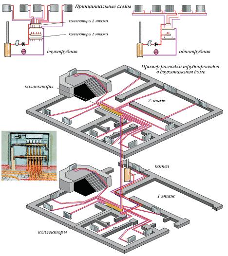 Коллекторная разводка предполагает, что на каждом уровне, в специально предназначенном шкафу, располагаются коллекторы, из которых к радиаторам отопления идут трубы и характеризуется независимым подключением каждого радиатора. Подобная схема разводки дает возможность регулировать систему и установку специальных электромоторов, поддерживающих заданную температуру в комнатах. Надо сказать, что коллекторная схема стоит дороже лежаковой на 10-15%, однако она признана более удобной в использовании и обслуживании.